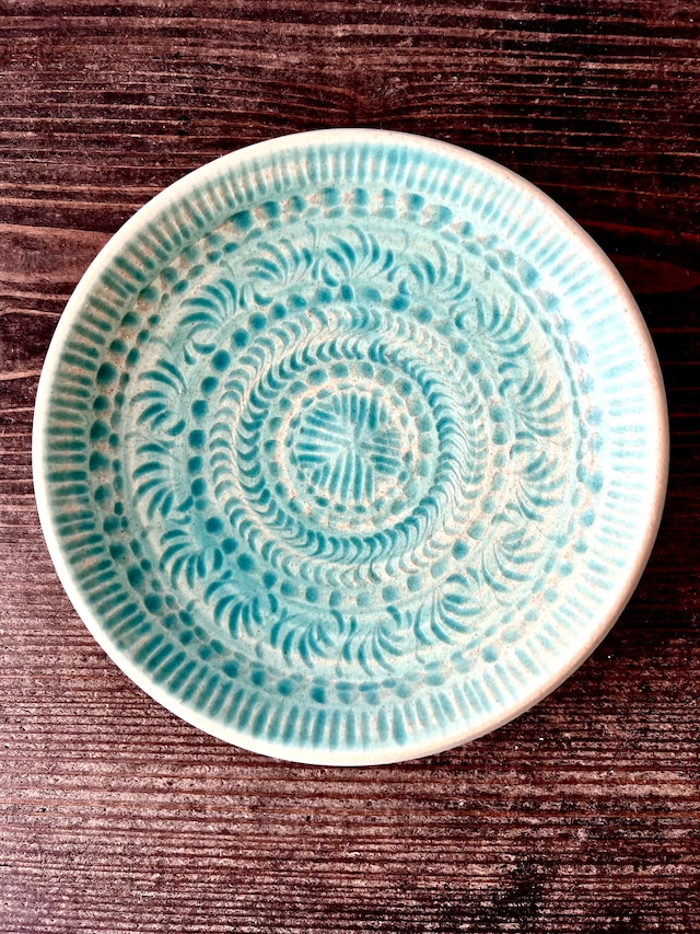 沖縄の海の色をイメージした碧の明るい線彫りの五寸皿。 海が大好きなsuiさんの明るい雰囲気がうつわに反映されています。 細かい線彫りの美しいお皿で食器として、またはアクセサリートレイ として使ってもいいですね。 サイズ 幅 約15.5cm 高さ 約3.5cm 産地 沖縄 素材 陶器 ※電子レンジ、食洗機のご使用は破損などの原因になりますのでおすすめしません。 【 sui 仲眞美帆 】 器好きが高じて壺屋焼の窯元で修行された後、北中城村にて工房『sui』を設立、開窯。 柔らかく優しい色合いで金彩がポイントの白シリーズ。 アンティークな雰囲気の黒シリーズ。 渋く深い色合いで男性にも人気の孔雀シリーズ など多彩な作風を常に進化させながら楽しみながら日々作陶されています。 ■ご購入前の注意事項■ 商品はすべてひとつひとつ手作りのため、形、大きさ、厚み等の多少の違い、個体差があります。 陶器にはピンホール(小さな穴)等や表面に入る模様のようなヒビ(貫入)も見受けられる場合もありますが、不良品ではございませんので、ご使用には問題ありません。 釉薬流れ、かすれ、鉄点、灰飛び、色ムラ、突起等も土物の手作りならではの ぬくもりを感じる色味や風合い、経年変化を楽しんでいただけたらと思います。 イッチン模様にひび割れがある場合もございますが、 イッチン模様の上に釉薬をかけていますので剥がれる事はほぼありません。 作家や窯元によって、価格の見直しや改定が行われる場合がございます。 実店舗でも販売しているため、売り切れになった場合はご了承ください。 商品についてご不明な点がございましたら、メールまたは電話にてお問い合わせください。