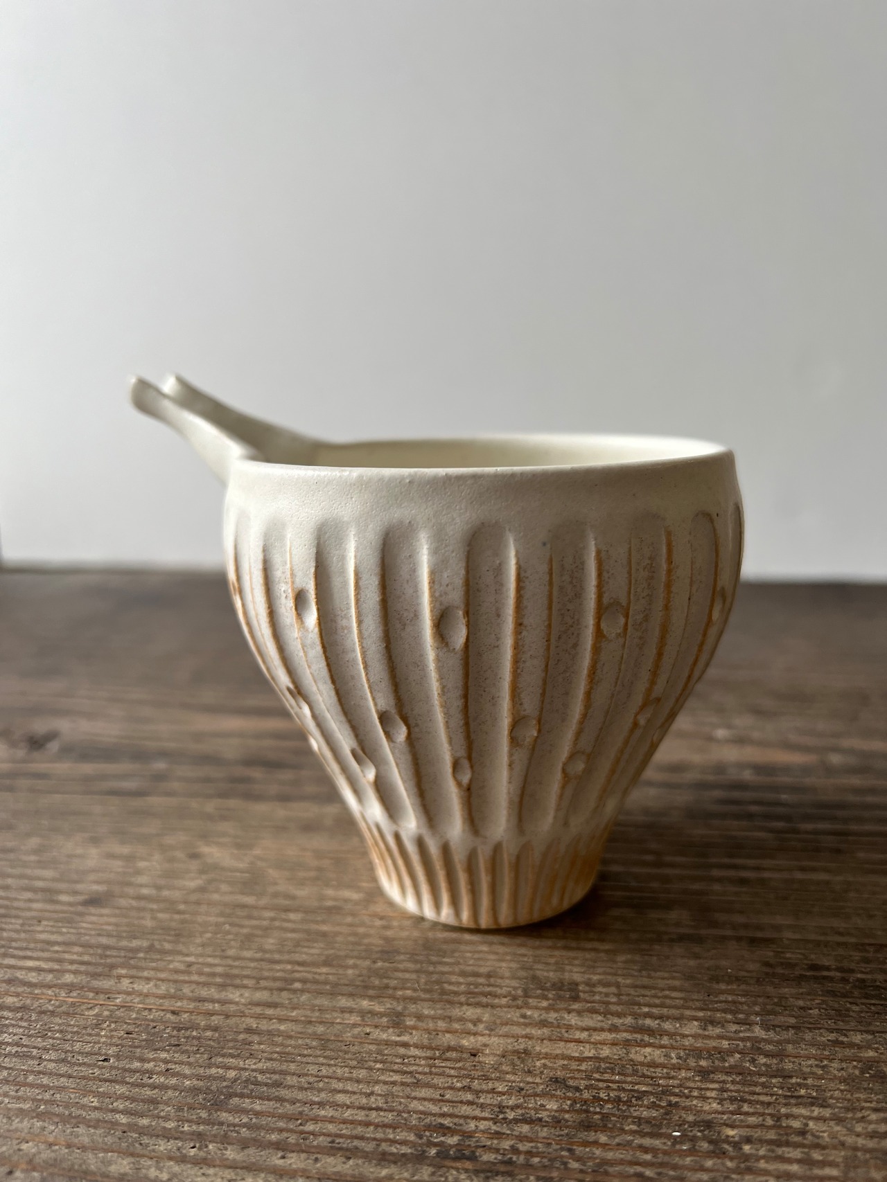 白いマットな質感と鎬模様が特徴的で可愛いらしいフォルムの片口になります。