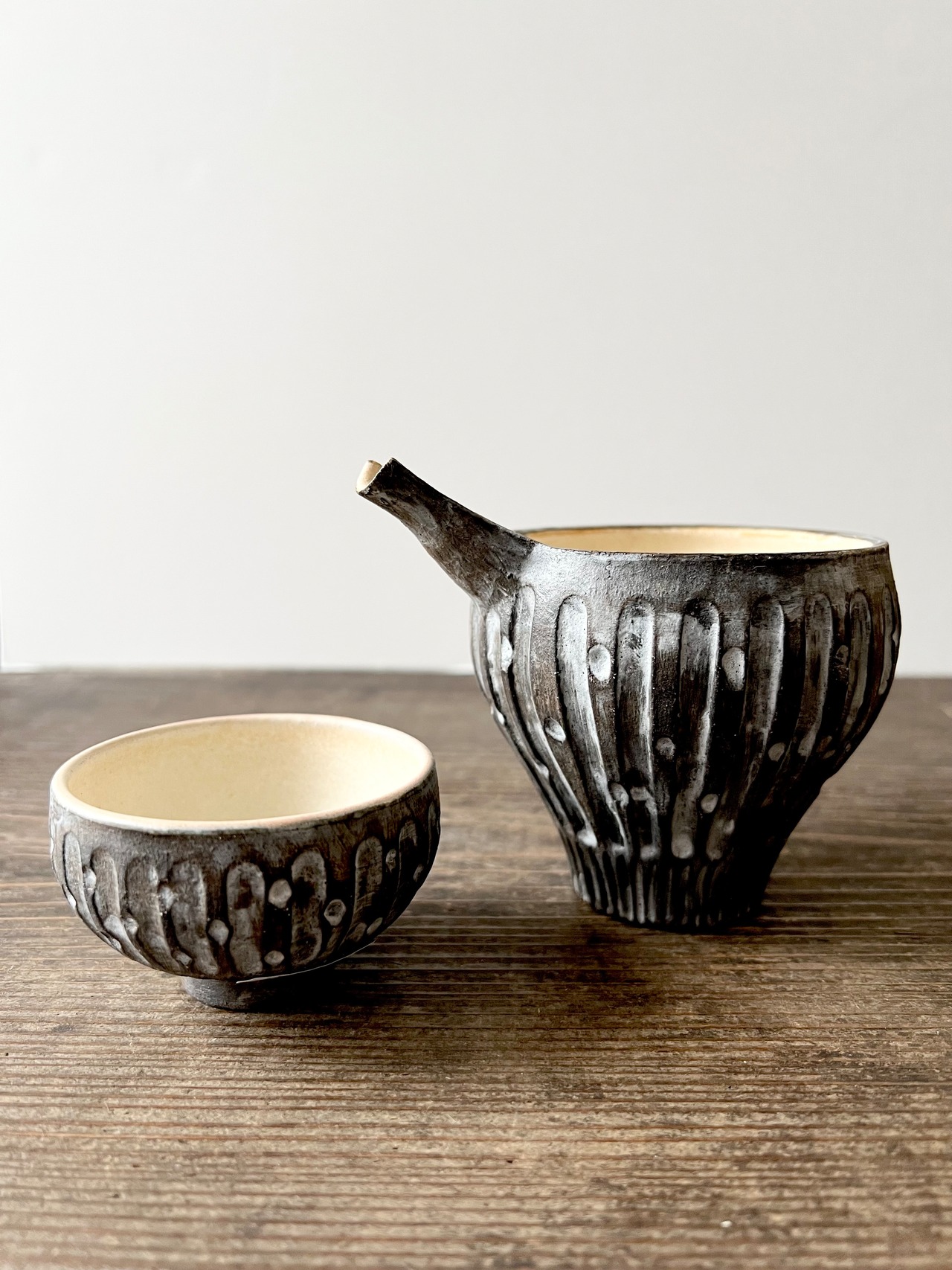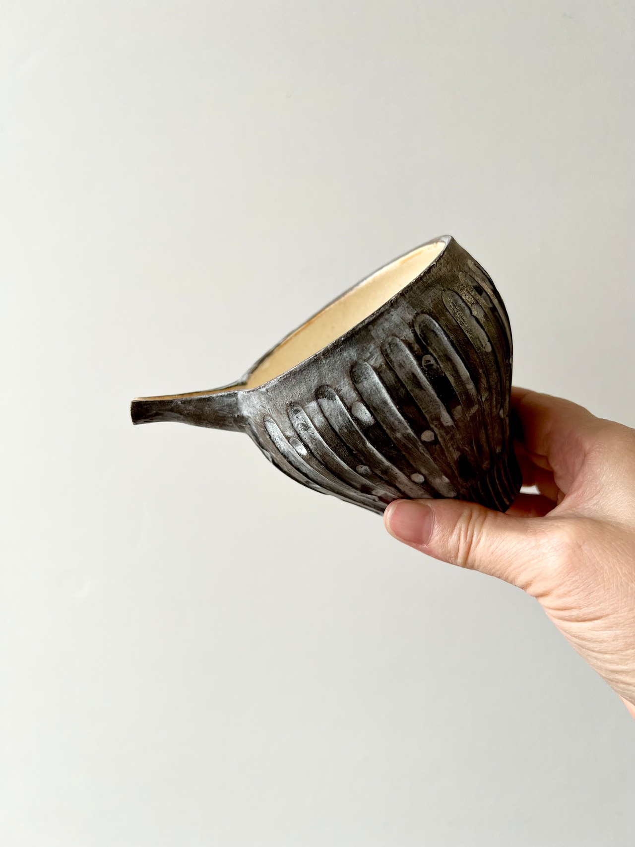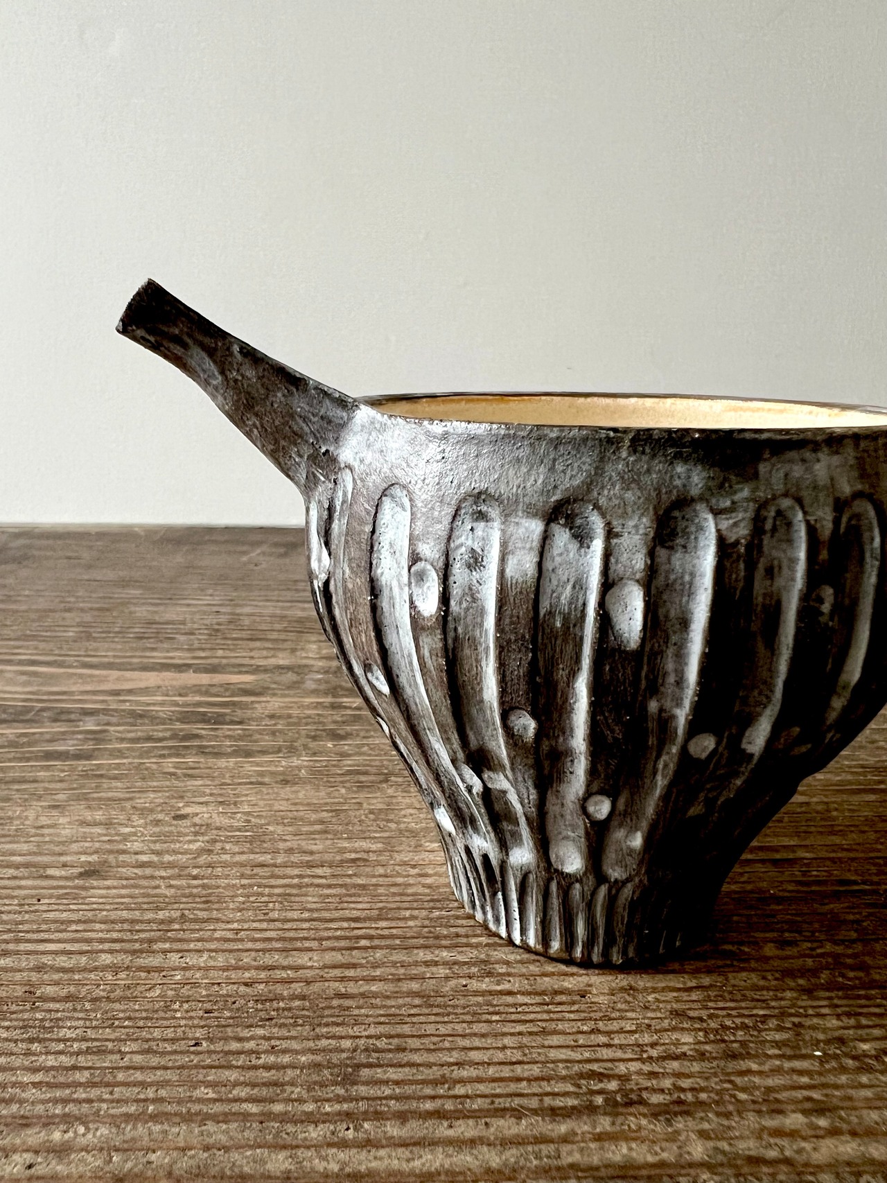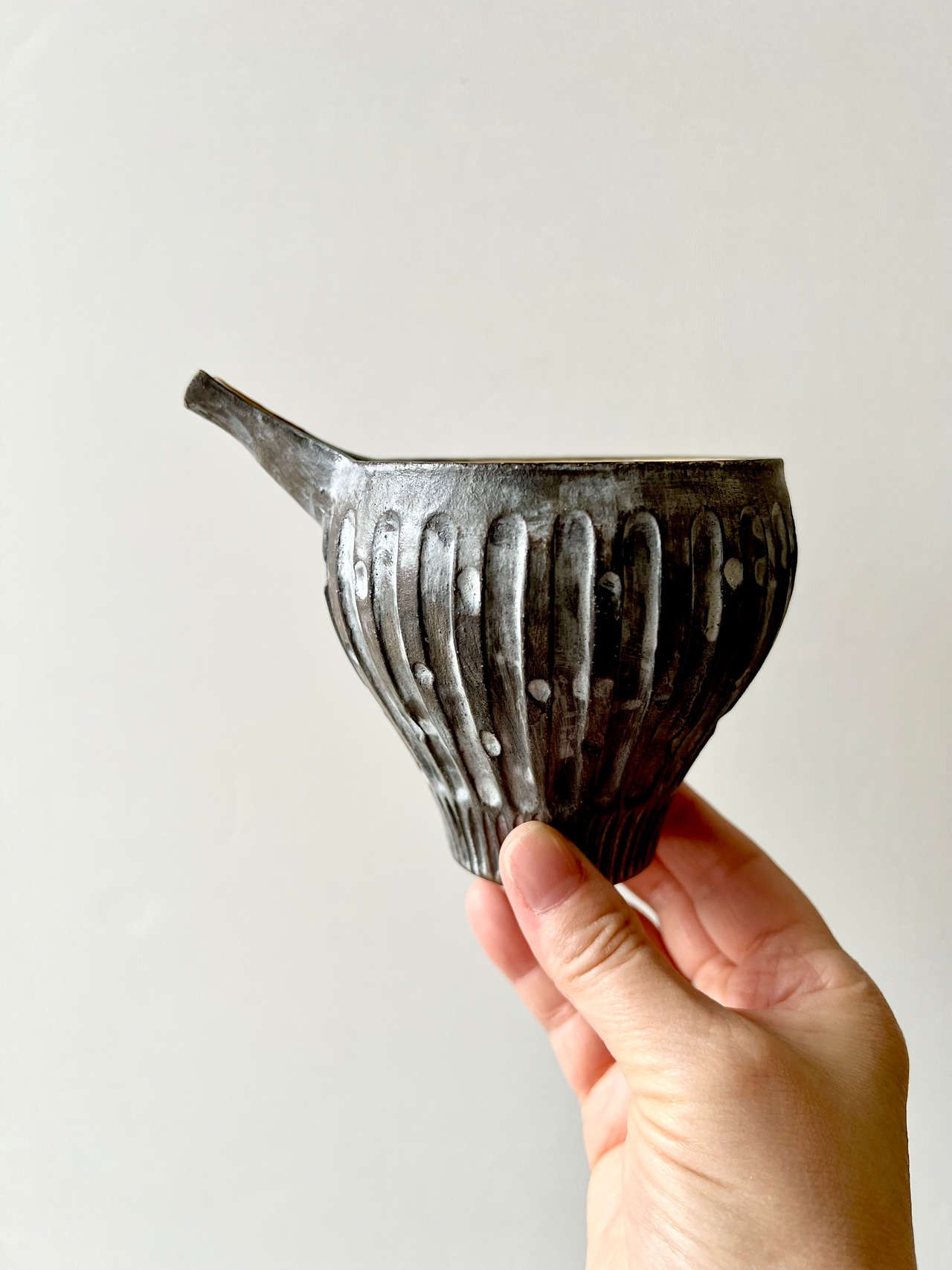 黒いマットな質感と鎬模様が特徴的で可愛いらしいフォルムの片口になります。