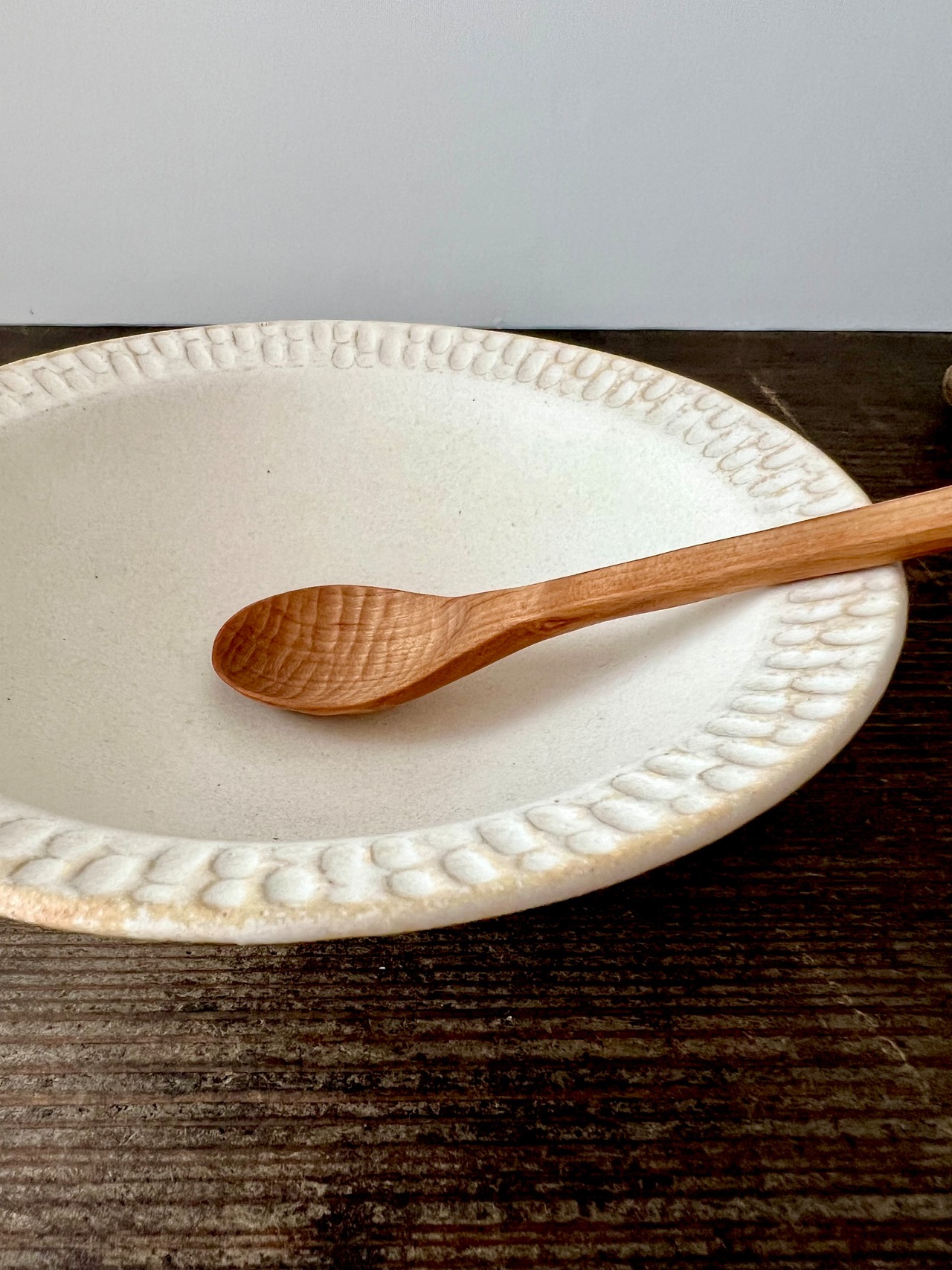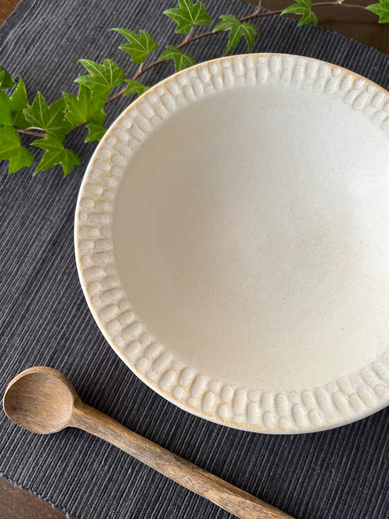 白いマットな質感が特徴的な、リム深鉢になります。スープなどの汁物やカレー、パスタ等に使い勝手の良いうつわです。