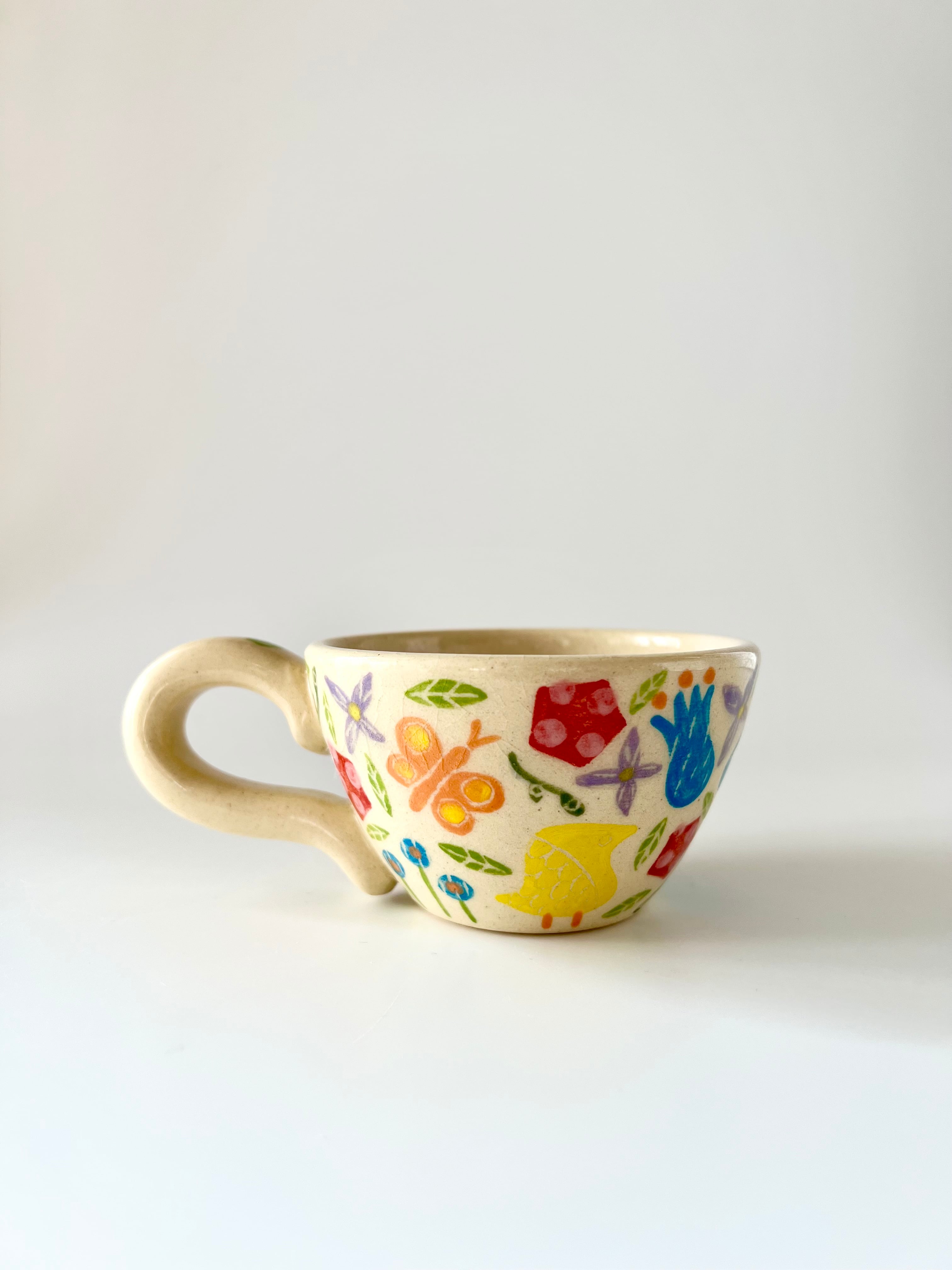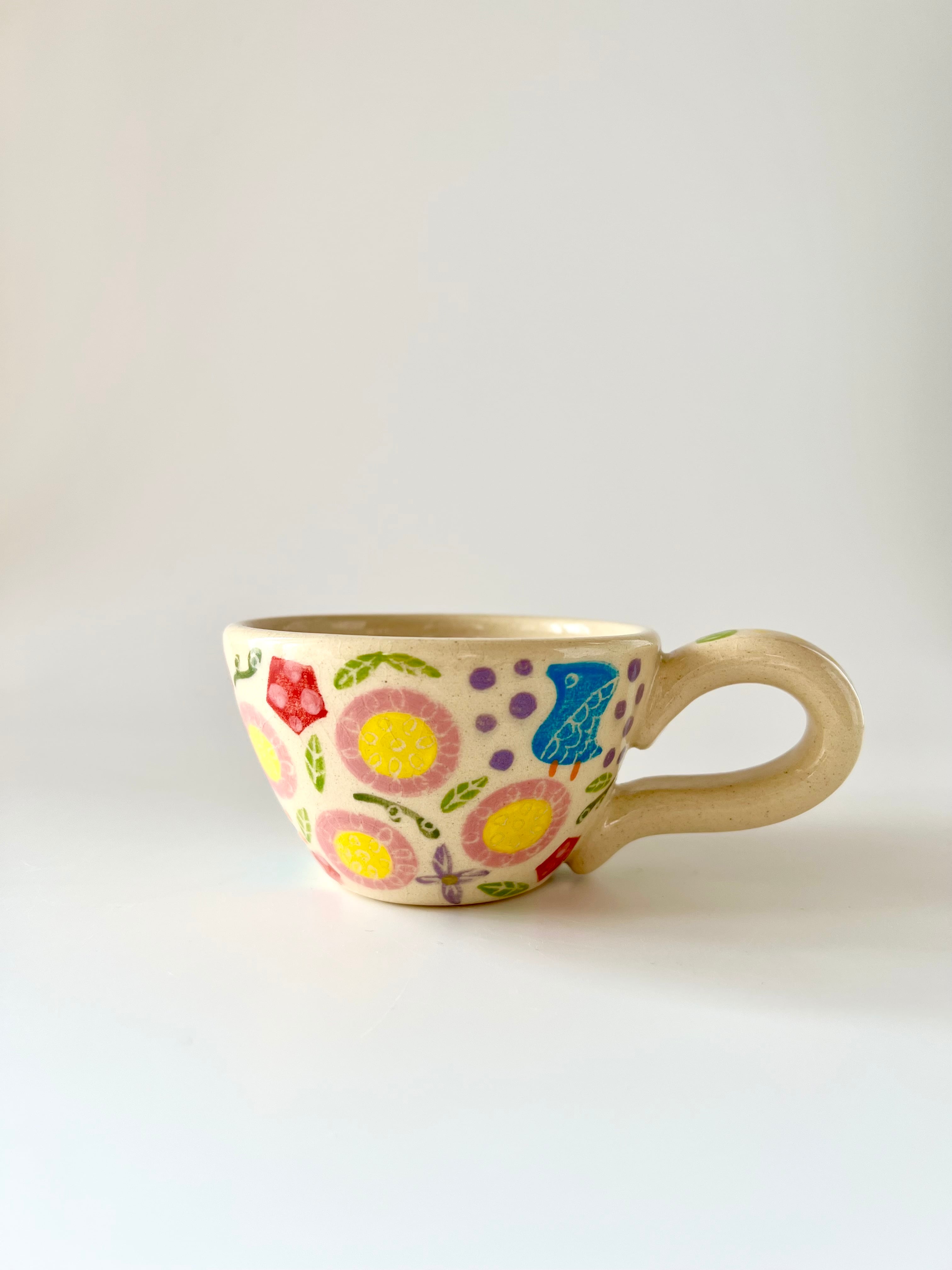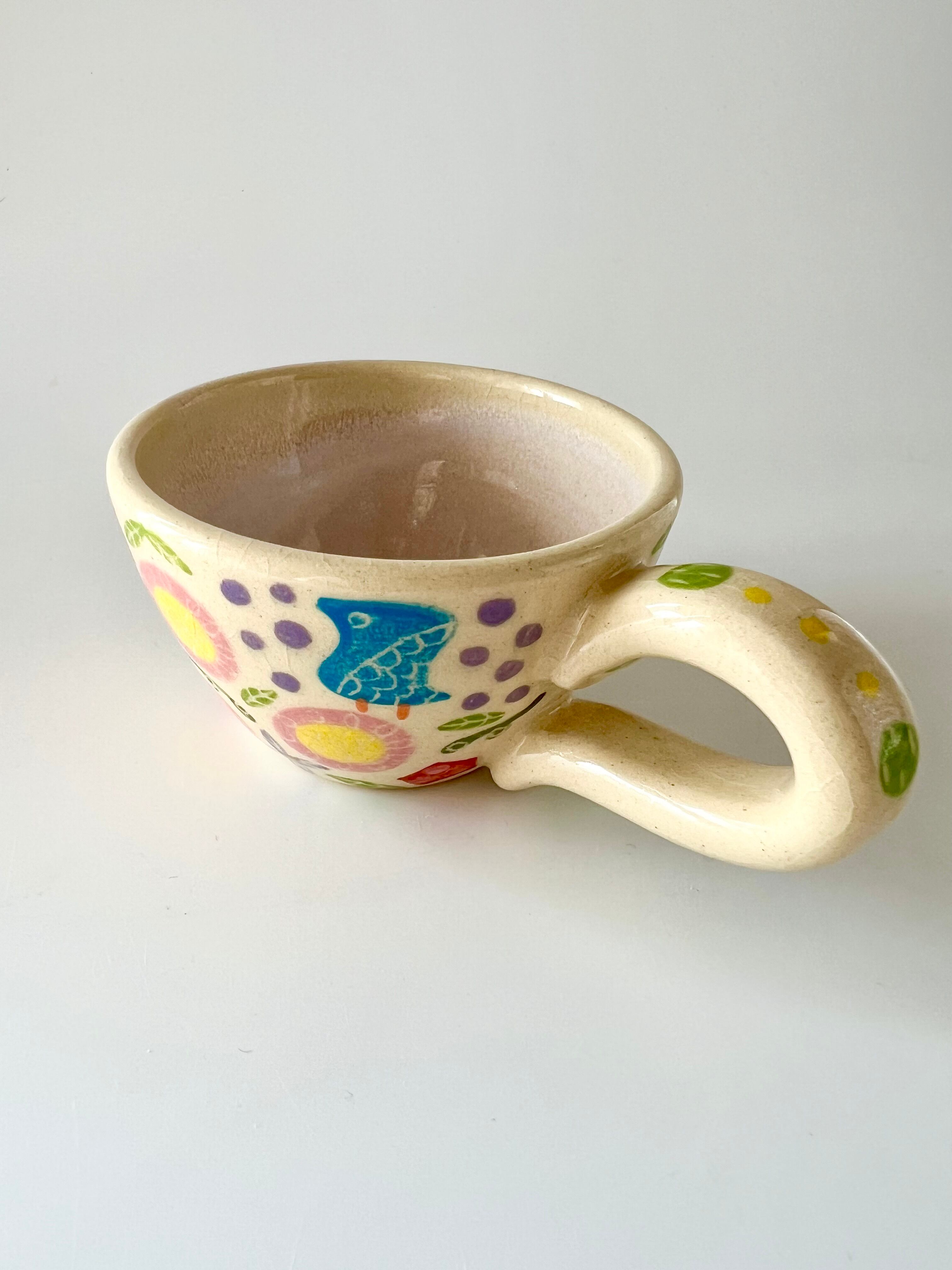 カラフルな絵付けが気持ちも明るくさせてくれるマグカップになります。お茶の時間も楽しいひと時になりそうですね。